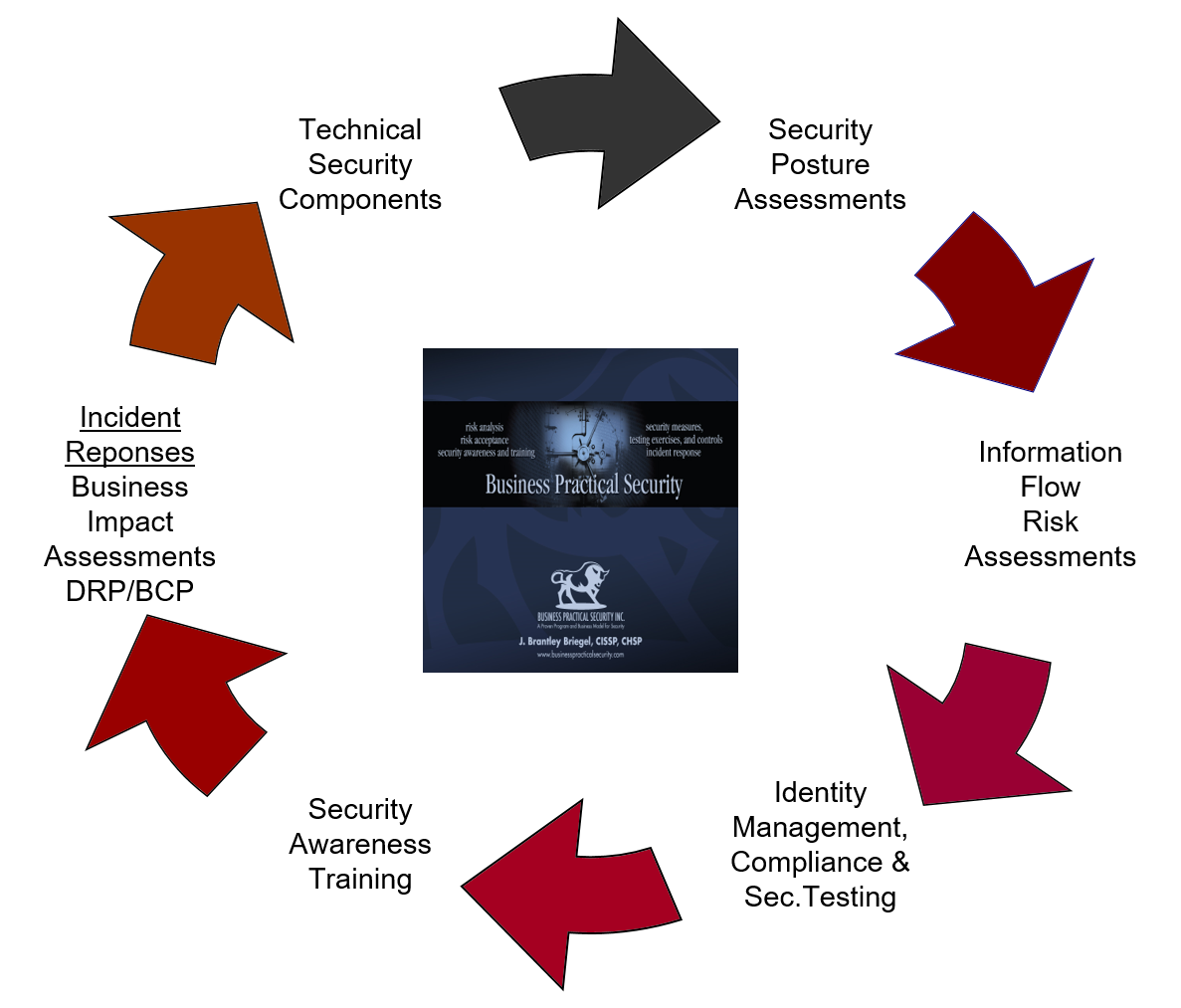 There are many information security policies, standards, procedures and template documentation packages or manuals from which to choose. We have evaluated and used many of them throughout the years. (The Manual) publication was developed, used, and evolved as a result. Therefore, it is a Proven Security Program & Business Model for Security. The diagram below illustrates the Business Practical Security Inc. program and business model depicting a series of processes, exercises, and/or testing requirements. In its entirety, it is a program and business model to apply security based on common and unique risks organizations face.